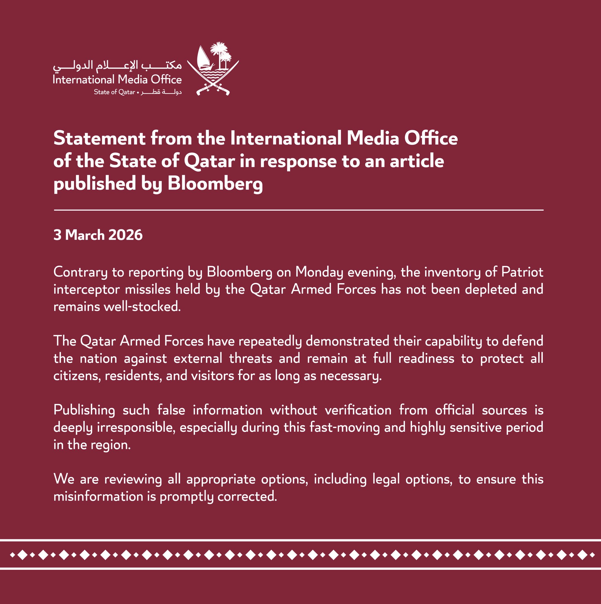 - ► Qatar’s International Media Office issued a formal response to a Bloomberg article.